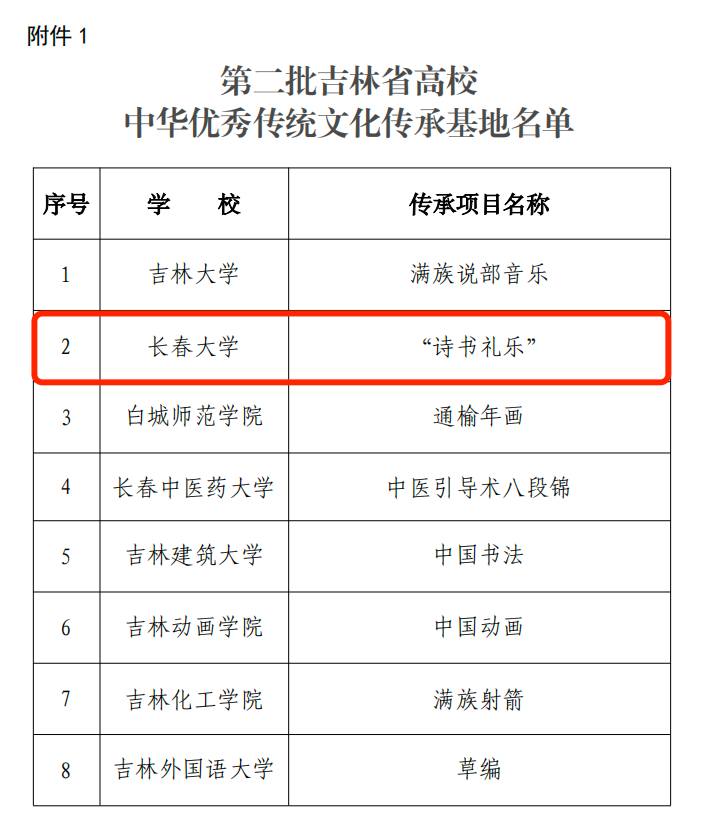 12月22日,吉林省教育廳下發了《關于公布第二批吉林省高校中華優秀傳統文化傳承基地名單的通知》。經高校自主申報、專家遴選、答辯、現場考核等環節,全省共8所學校獲得中華優秀傳統文化傳承基地認定,我?!霸姇Y樂”傳統文化傳承基地位列其中。