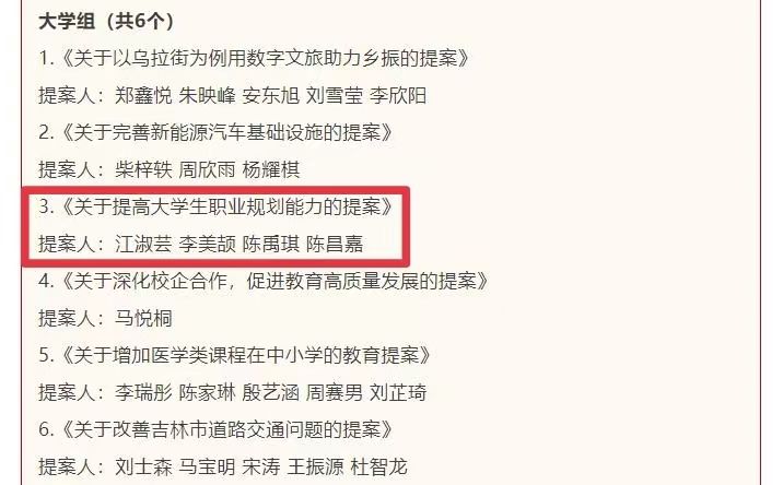 近日,吉林省政協公布了2023年吉林省青少年模擬政協提案評選結果。由我校模擬政協協會江淑蕓、李美頡、陳禹琪、陳昌嘉4名同學提交的《關于提高大學生職業規劃能力的提案》榮獲大學組“優秀提案”稱號。